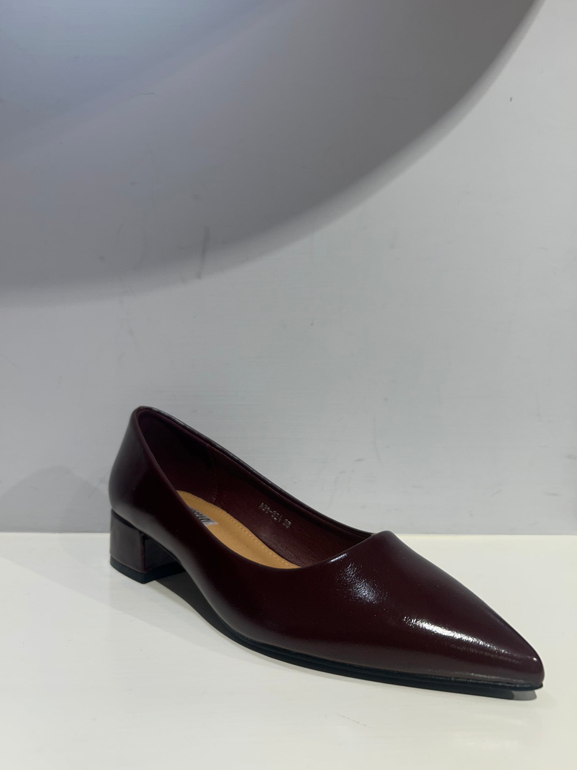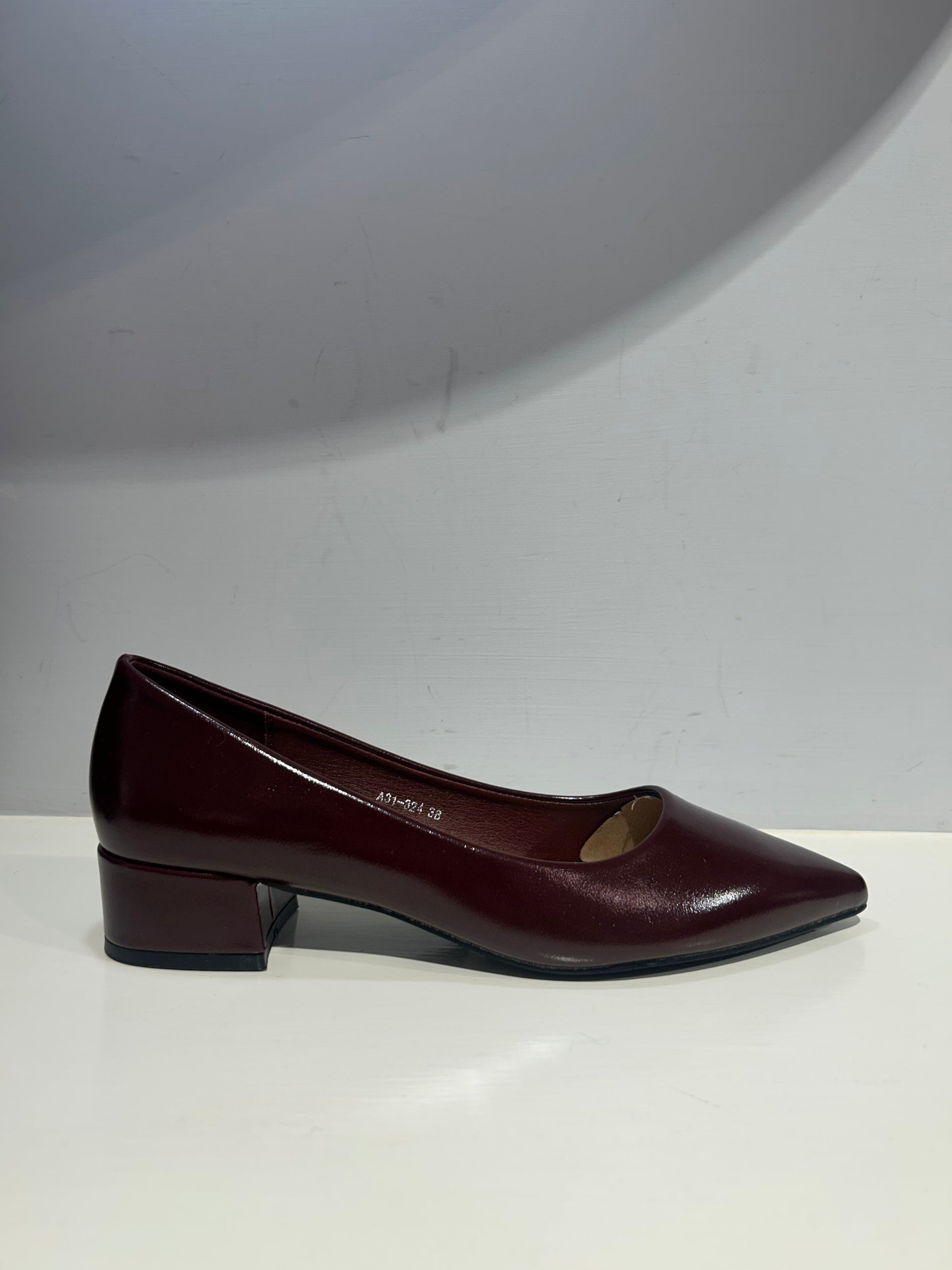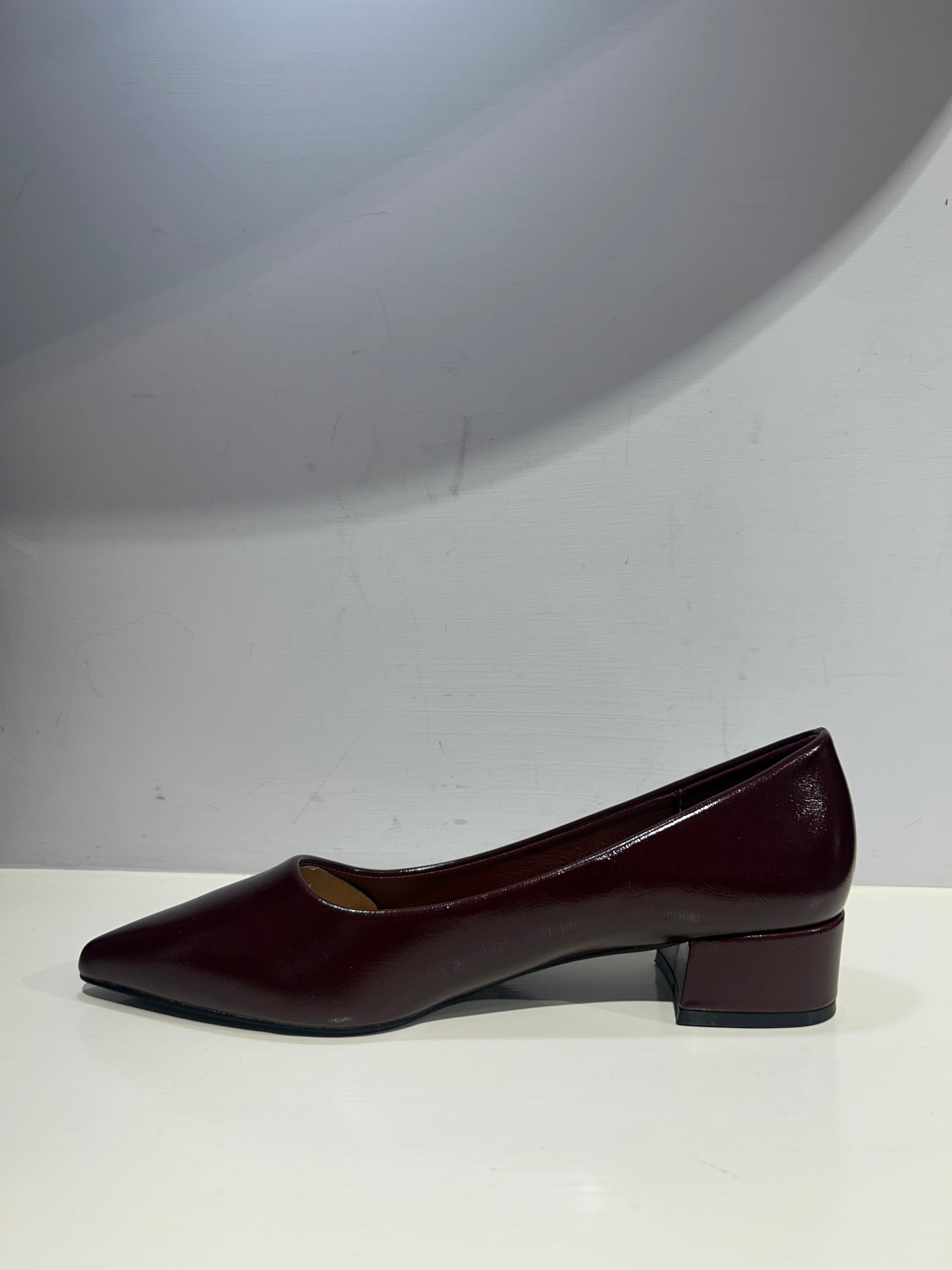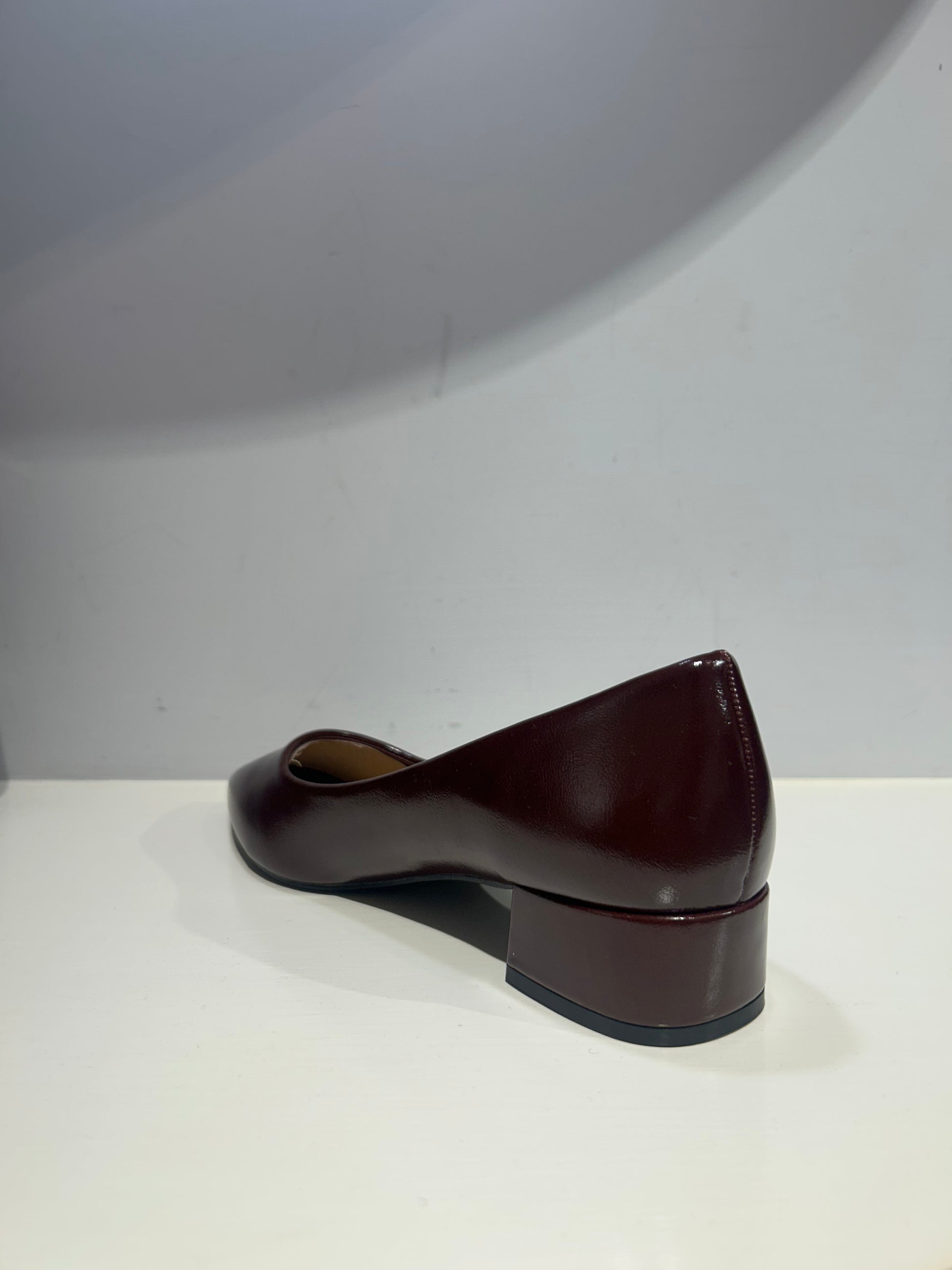 Ballerina a punta con tacco basso color Bordeaux lucide.