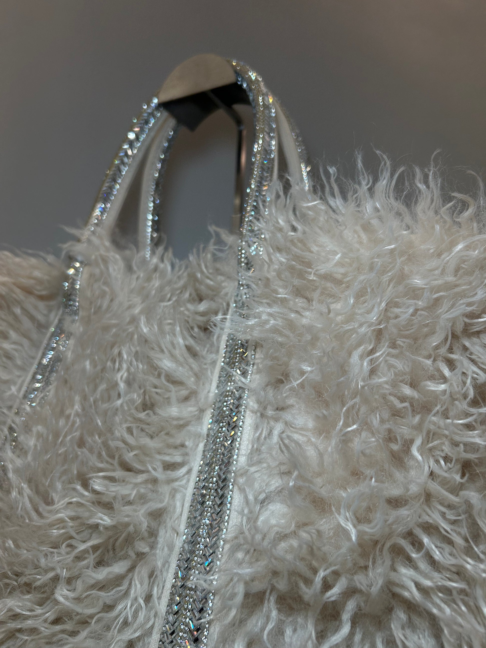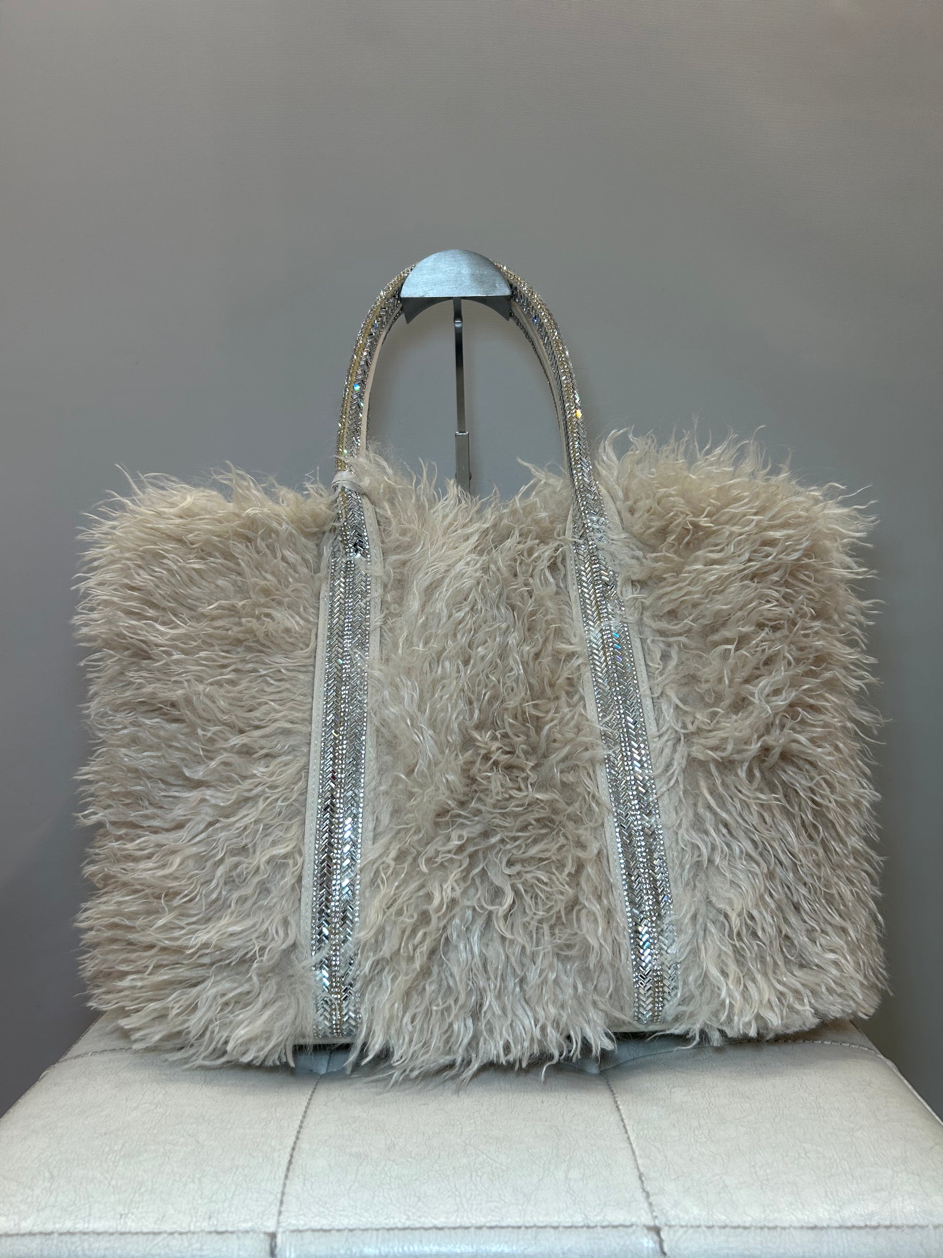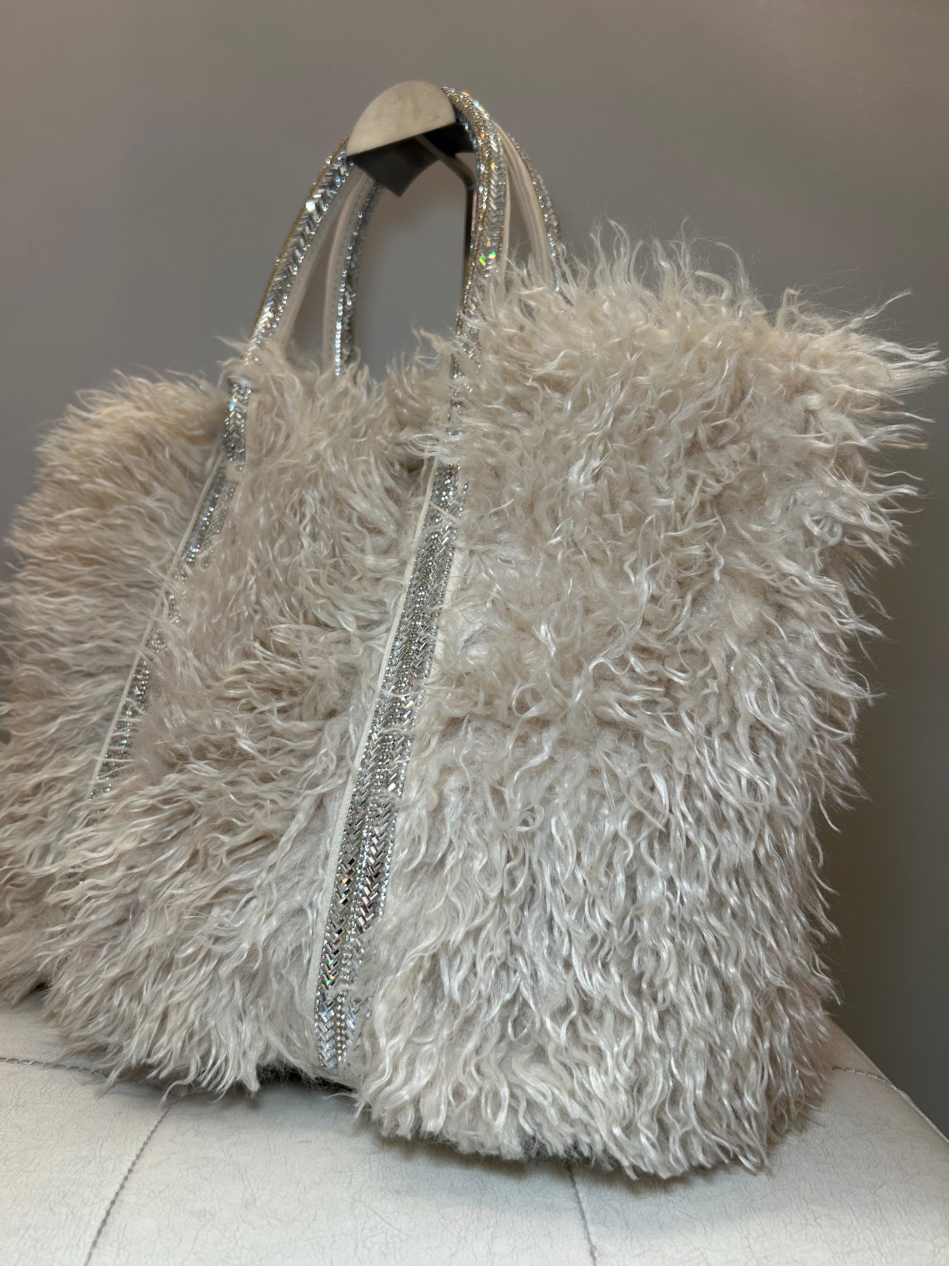 Borsa a mano color Avorio, versione LARGE, con pelo e strass.