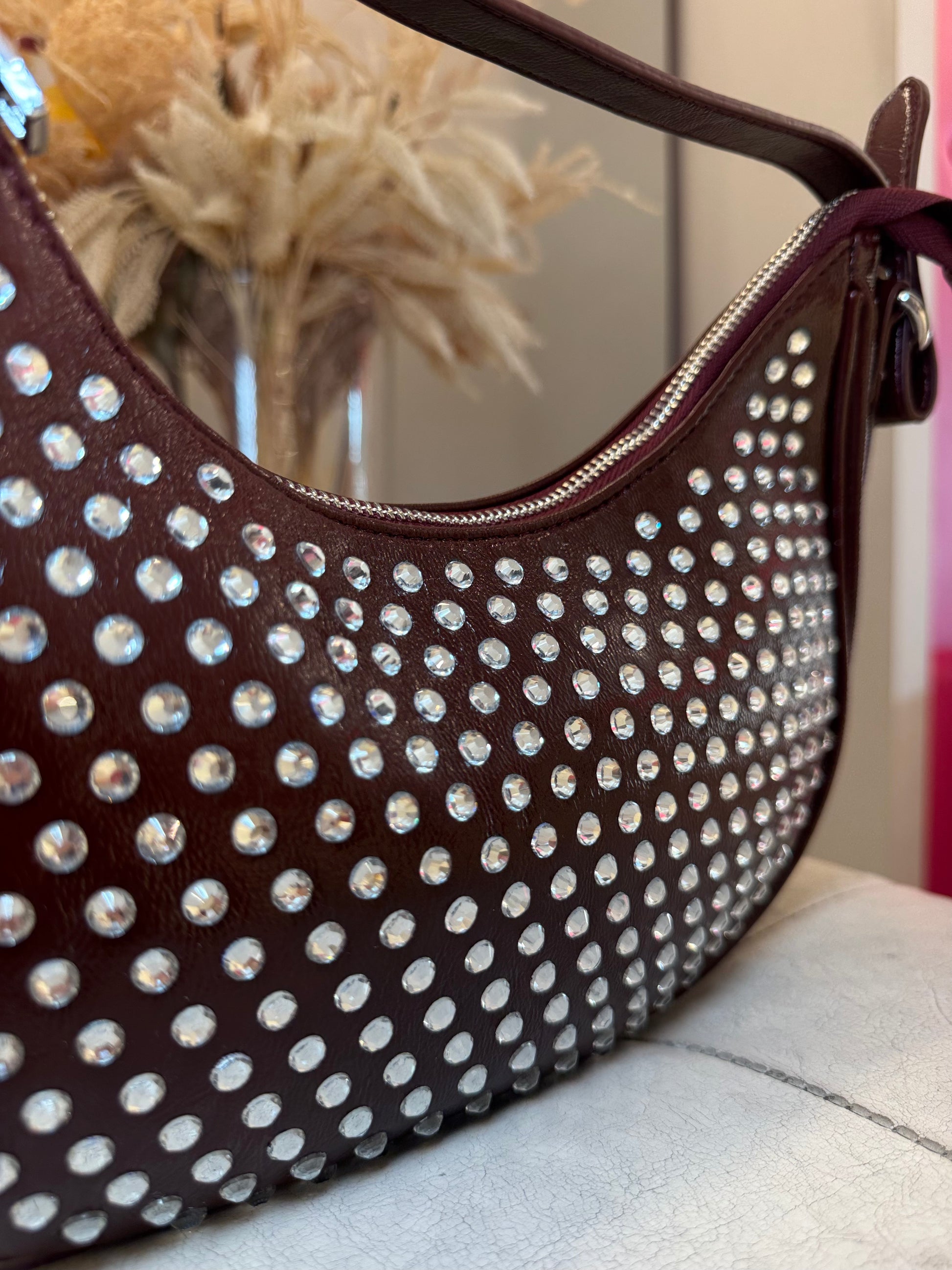 Borsa a mano color Bordeaux con brillantini e tracolla all'interno