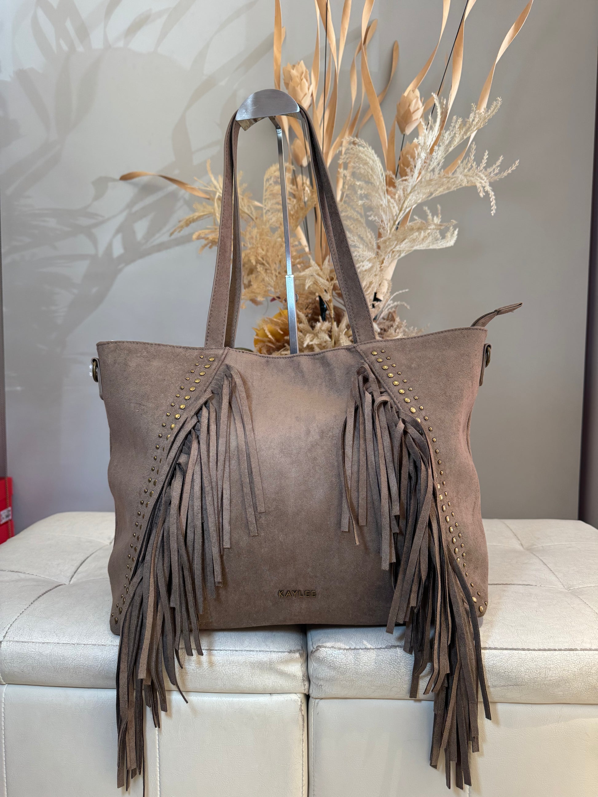 Borsa a spalla Kaylee con frange color Taupe con tracolla all'interno